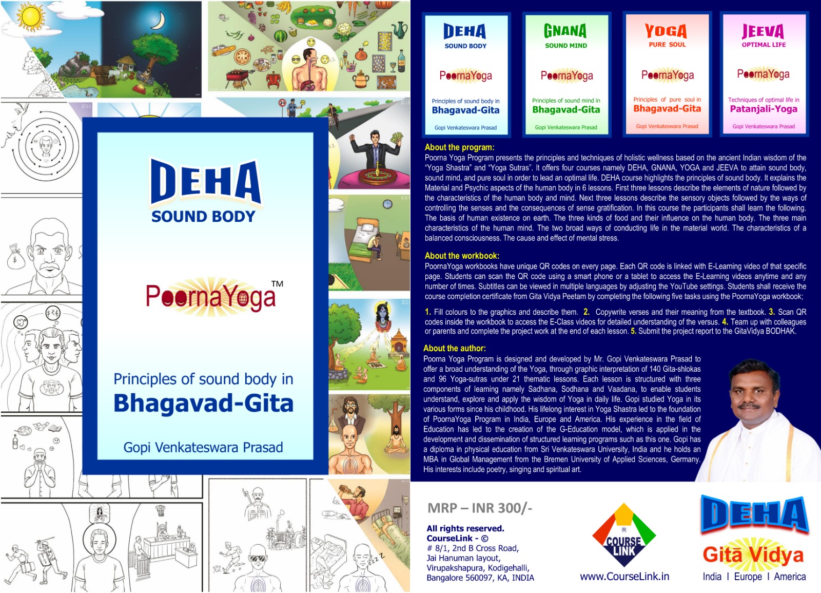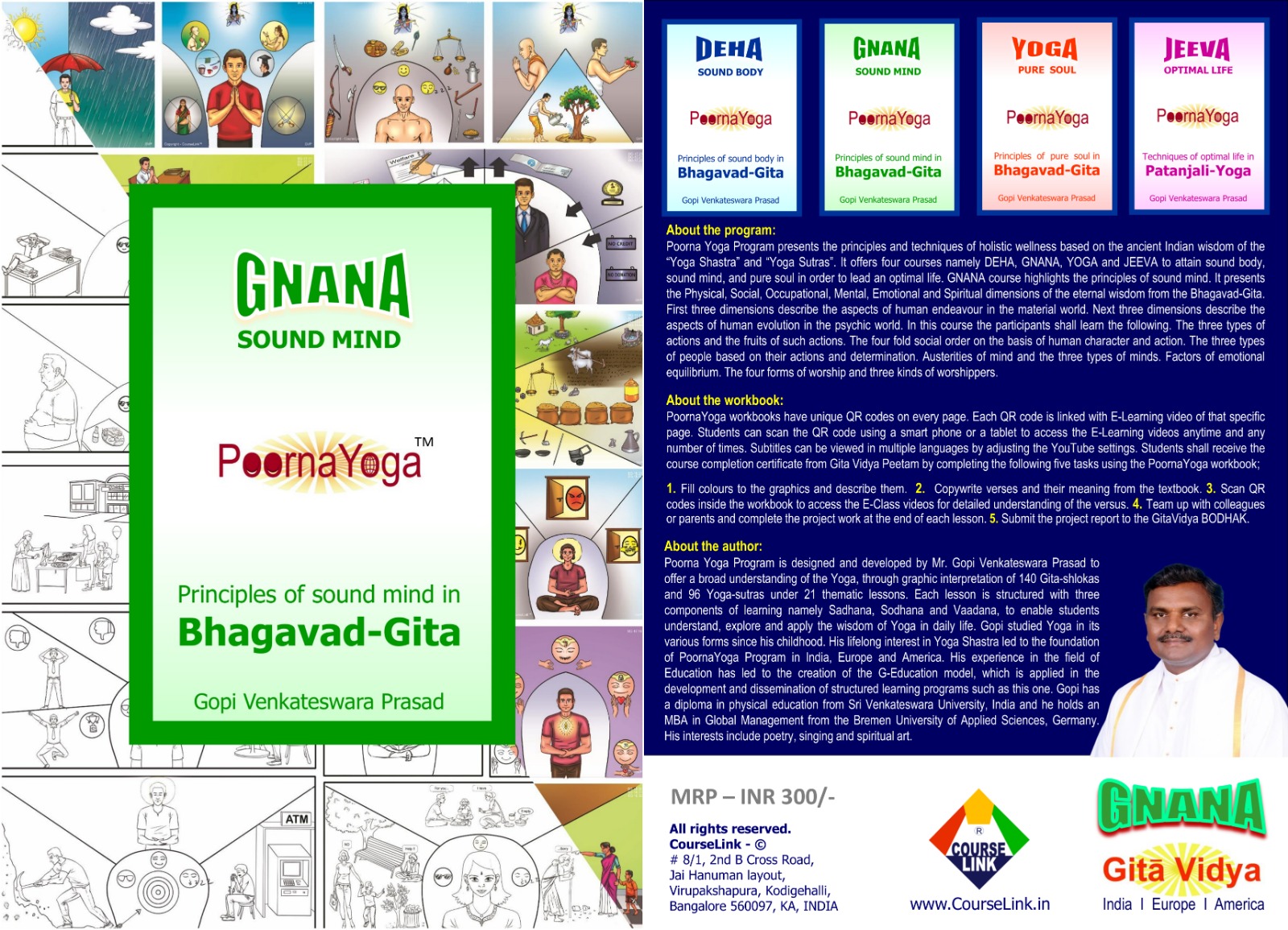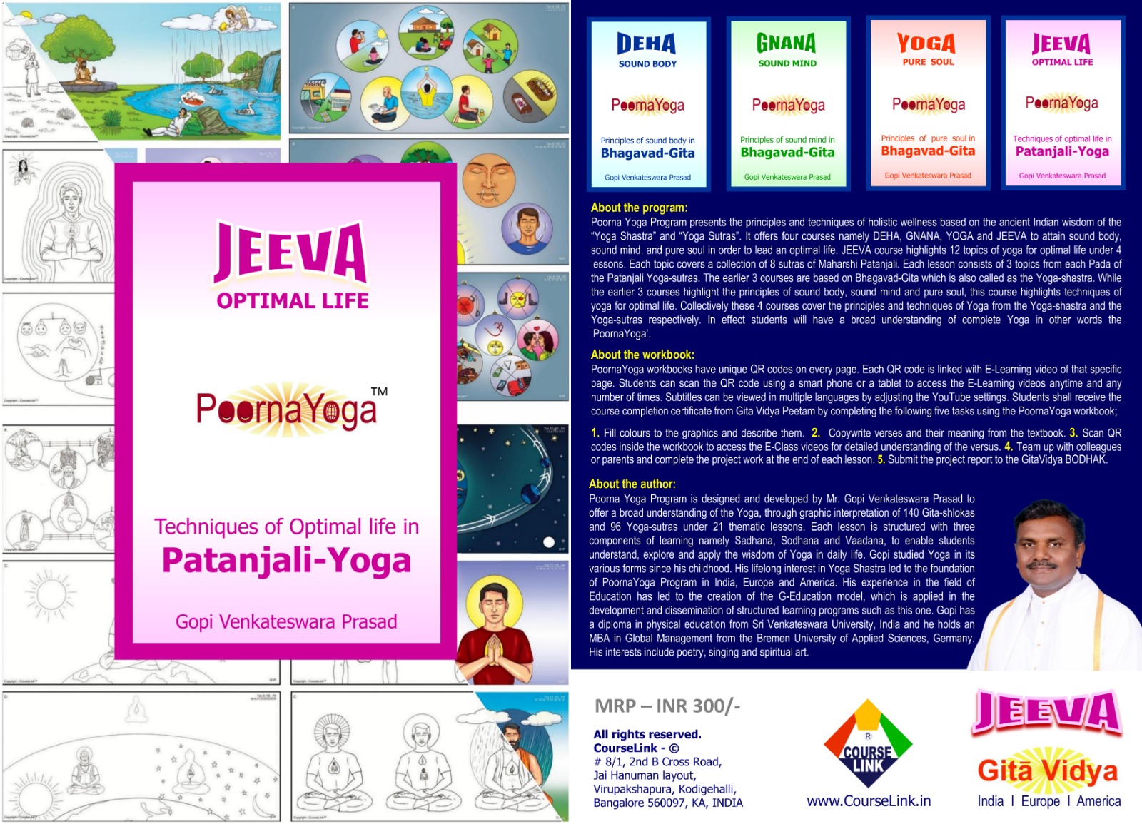 The PoornaYoga Self-Learning Program is open for all age groups. Anyone from across the different time zones of the world can pursue this program at their own convenience. The PoornaYoga Self-Learning Program has four courses namely DEHA, GNANA, YOGA and JEEVA. All four courses are available in a single textbook. Each course has a separate workbook. It is essential to obtain the textbook and workbooks to enrol, study and complete the program. The course completion certificate is awarded by the ‘Gita Vidya Peetam’ after the successful completion of each of the four courses. After completing all the four courses the student is awarded with the “PoornaYoga certificate”. For further information please visit the www.GitaVidya.org website. To enrol for the PoornaYoga Self-Learning Program please click the following link and fill the form.