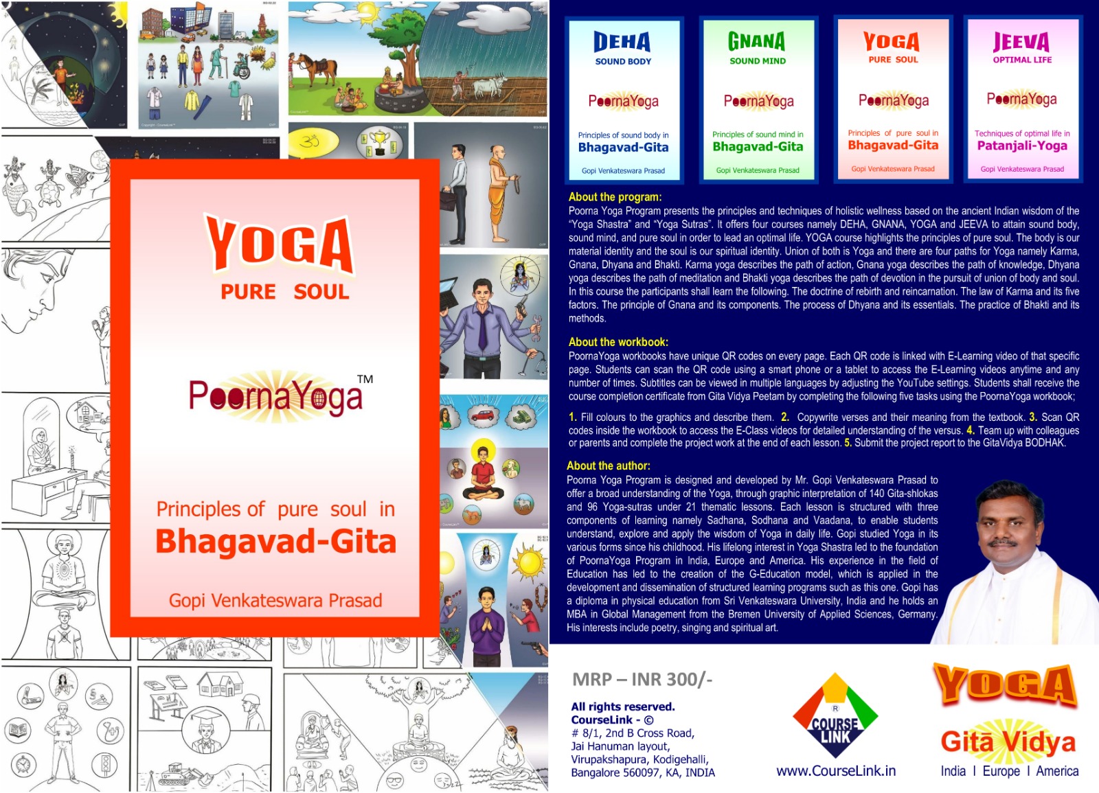 Poorna Yoga Program aims to offer a broad understanding of PoornaYoga, through 140 Gita-shlokas and 96 Yoga-sutras under 21 thematic lessons, which are grouped into four courses namely DEHA, GNANA, YOGA and JEEVA. Each lesson is structured with the G-Education model using the three components of learning namely Sadhana, Sodhana and Vaadana, which enable students to understand, explore and apply the wisdom of Yoga in daily life.